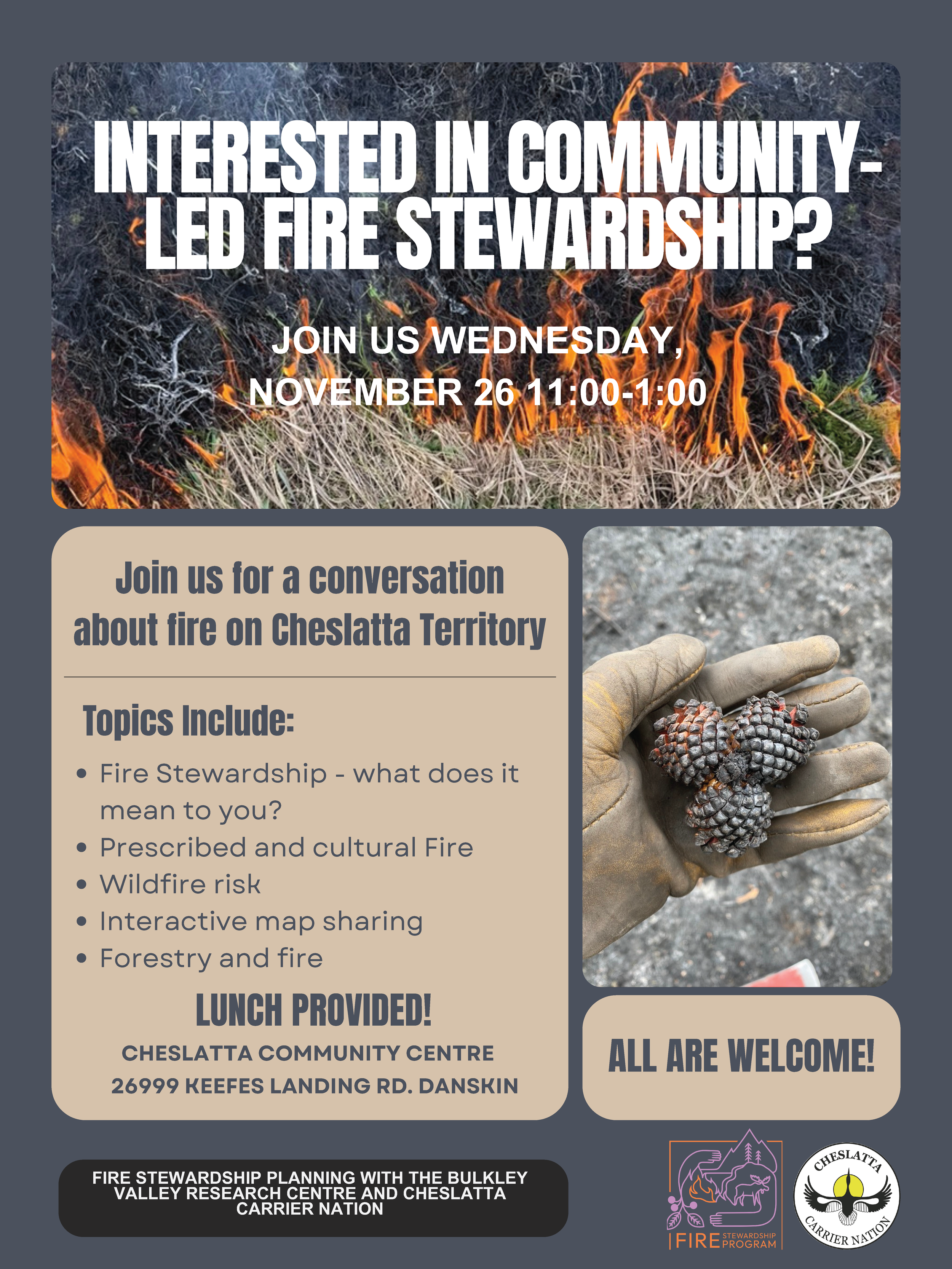 Please join us this Wednesday, November 26, from 11AM - 1PM at the Cheslatta Community Hall for a conversation about Community-Led Fire Stewardship.
