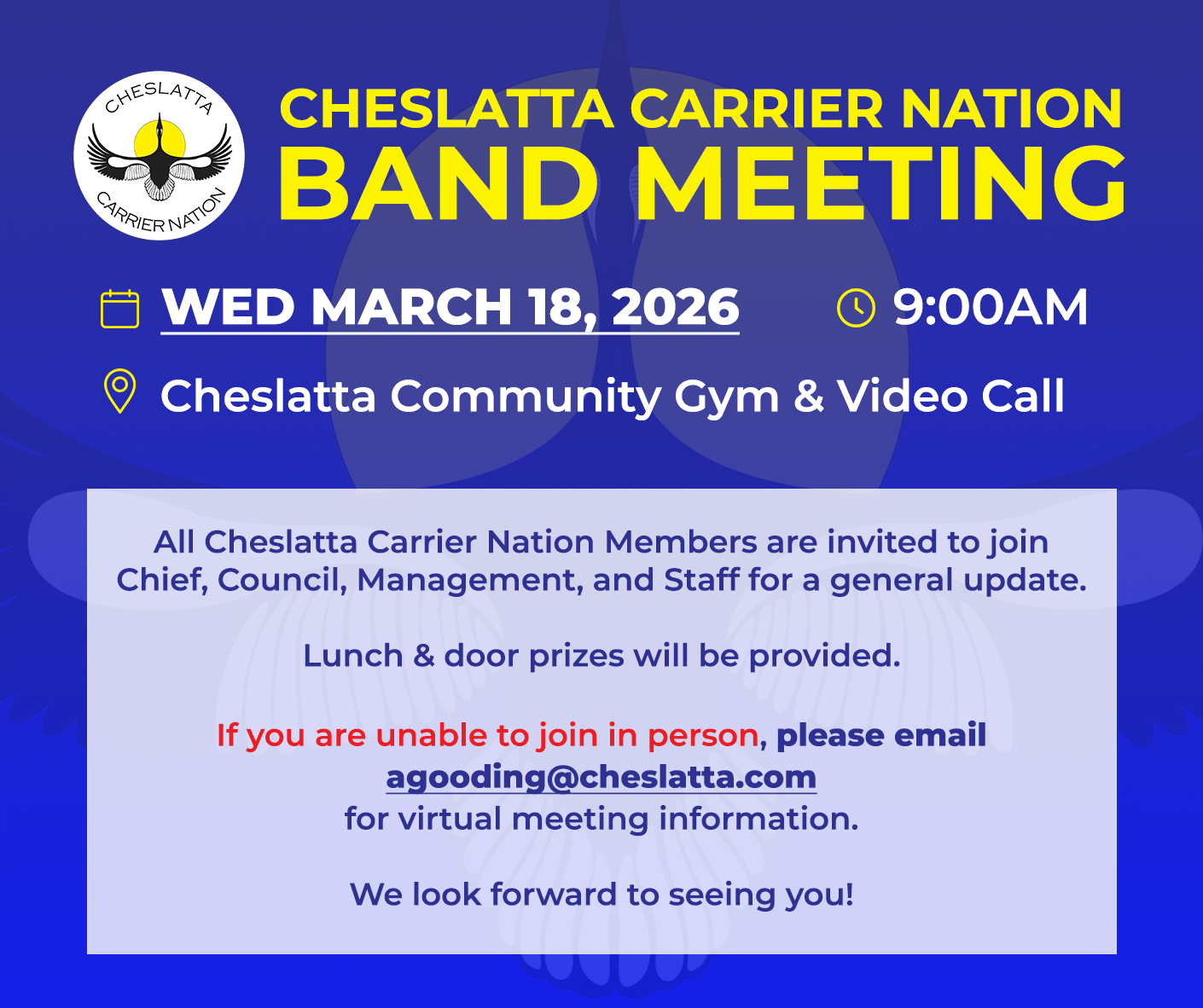 Members, please join us Wednesday, March 18, for a General Band Meeting starting at 9AM at the Cheslatta Community Gym or virtually by emailing agooding@cheslatta.com.